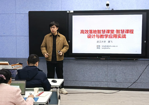 培训会上,唐飞教授采用现场教学与案例展示相结合的方式,围绕“AIGC赋能智慧课程全流程全环节”进行了系统而深入的分享。他从提示词工程激发AI潜能切入,全面解析了智慧课堂高效落地的五大核心环节:一是基于学情精准设定教学目标;二是构建逻辑清晰的知识图谱与问题图谱;三是实现教学资源的智能关联与动态调用;四是通过任务引擎驱动学生主动学习;五是打造具备“会思考、能互动、懂反馈”能力的AI助教。唐教授不仅展示了先进的教学理念和方法论体系,更结合自身在智慧课程建设中的丰富实践经验,提供了可复制、可推广的操作路径,为参训教师带来了一场兼具理论高度与实践深度的教学革新之旅。