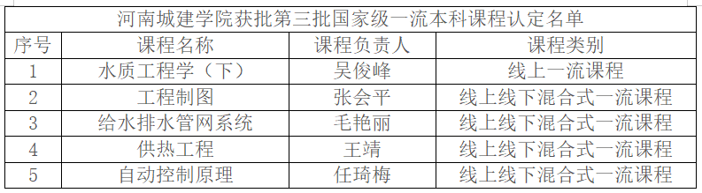近日,教育部发布《关于公布第三批国家级一流本科课程认定结果的通知》,我校《水质工程学(下)》等5门课程成功入选国家级一流本科课程。其中,线上课程1门、线上线下混合式课程4门。截至目前,我校累计获批国家级一流本科课程7门、省级一流本科课程50门,课程建设成效显著,彰显了学校在应用型人才培养体系建设中的扎实成效。