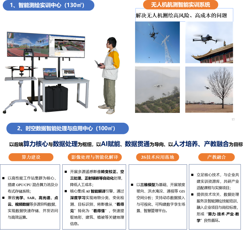 平台以AI赋能为核心,构建两大中心。一是智能测绘实训中心,包含数字测图智能实训系统,实现虚实融合、内外业一体化教学,支持复杂场景解析与多人协同操作;无人机航测智能实训系统,支持AI自动生成飞行场景,智能分析航线合理性、操作规范性,模拟炸机等应急情况;同时设有课程思政展示区,展示专业发展、前沿技术与项目成果。二是时空数据智能处理与应用中心,搭建GPU/CPU混合算力池,支持多源异构数据快速处理;集成YOLO、U-Net等AI解译模型,实现地物分类、变化检测、目标识别;并开展坡度分析、洪水淹没模拟、数字孪生场景构建等GIS集成应用,形成“算力—技术—产业—教学”良性循环。